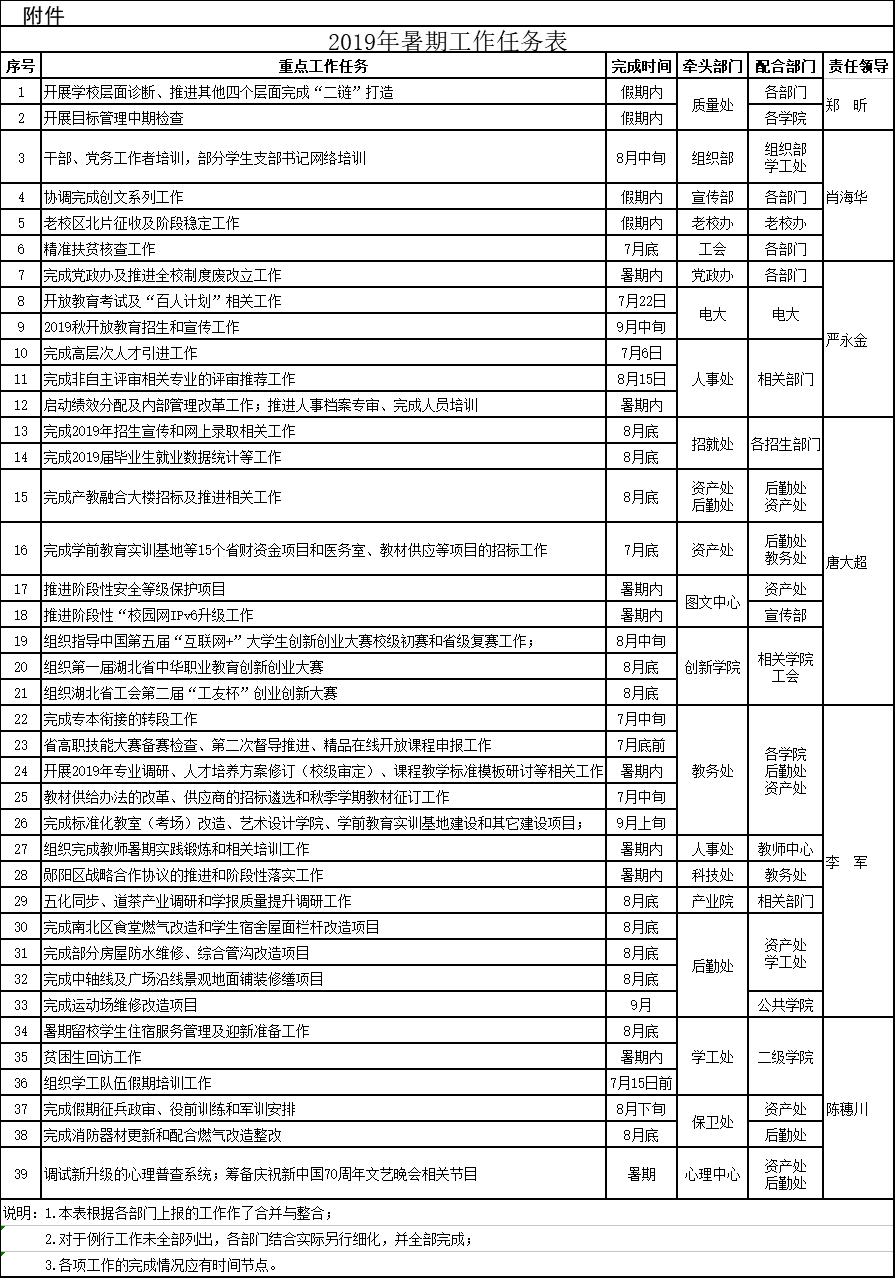 根据学校校历安排和校长办公会议精神,现就2019年暑期工作安排通知如下: