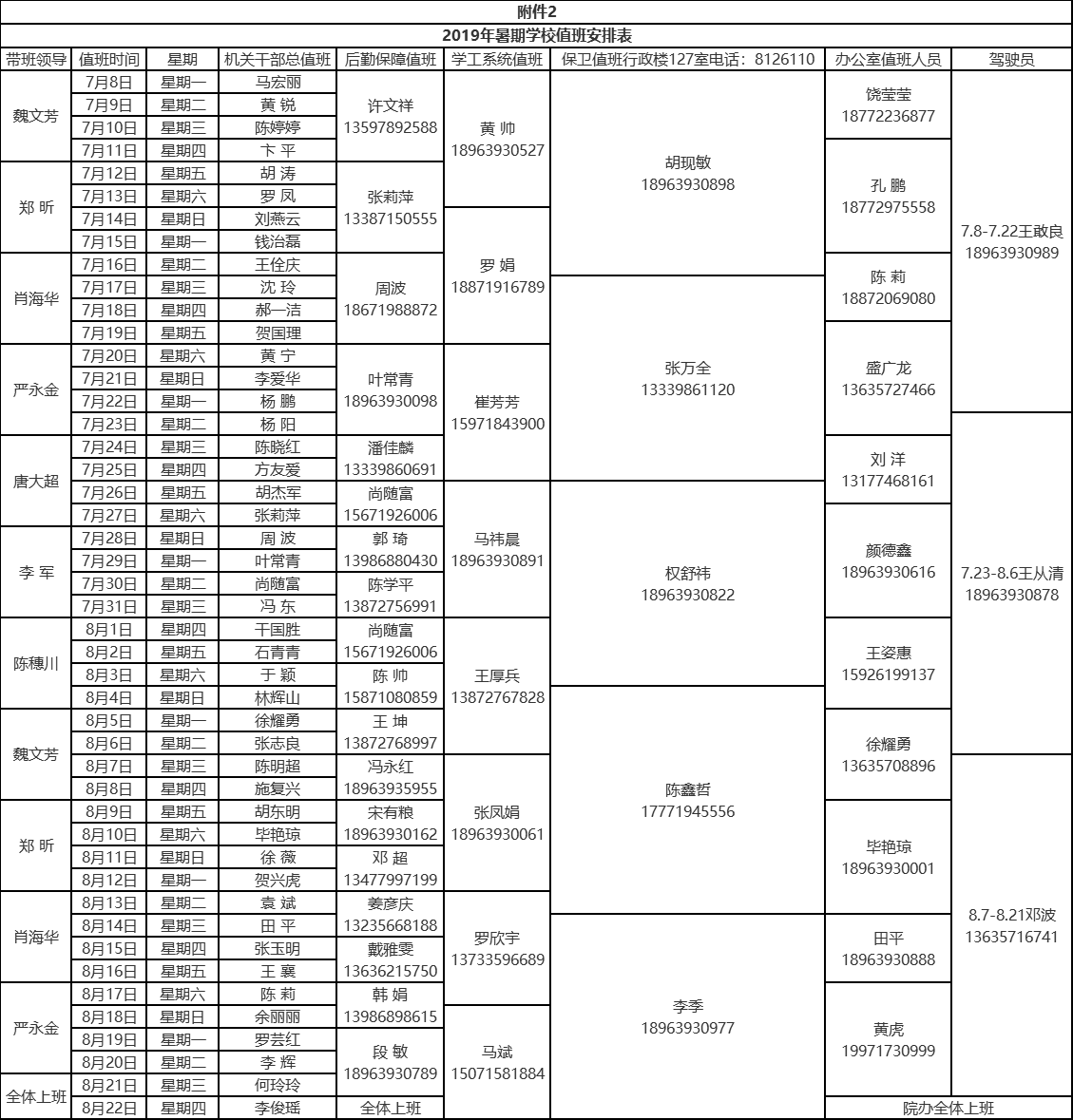 1.带班领导保持电话24小时畅通,负责值班内各类重要事务的处理,负责对各系统值班的抽查、检查,确保校园的安全稳定和各项工作的有序开展;办公室日常值班(双休日电话保持畅通)负责办公室日常事务服务;