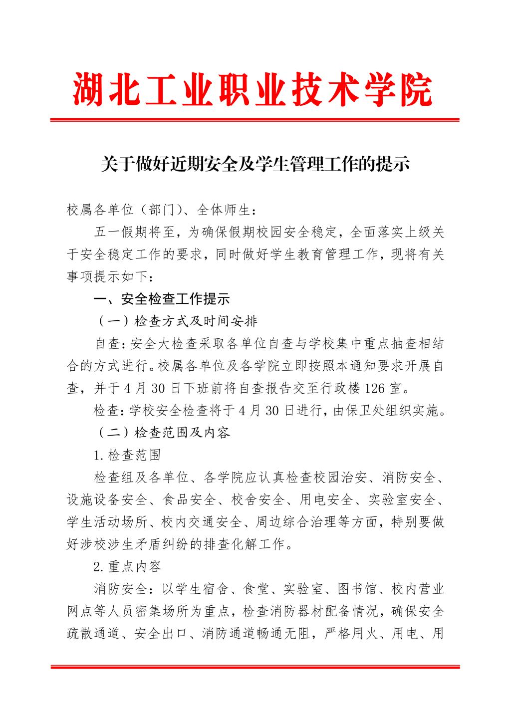 关于做好近期安全及学生管理工作的提示