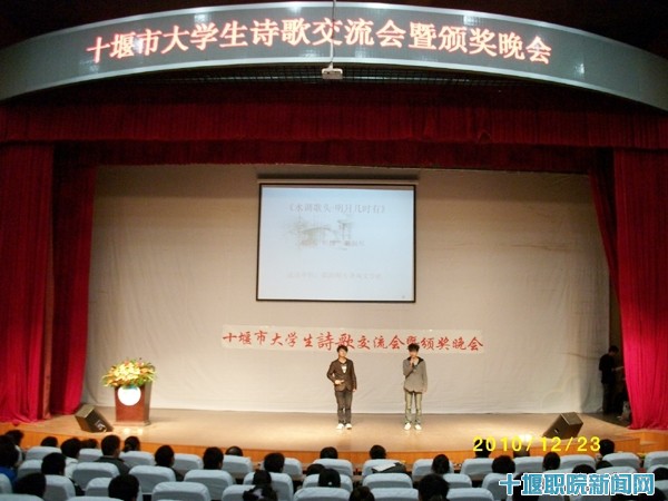 12月23日晚,由我院追天文学社承办,湖北医药学院江汉潮文学社和百草诗社、湖北汽车工业学院光线文学社和轩辕文学社及阳光左岸文学社、郧阳师专圣风文学社协办的十堰市大学生诗歌交流会暨颁奖晚会在我院会议中心举行。