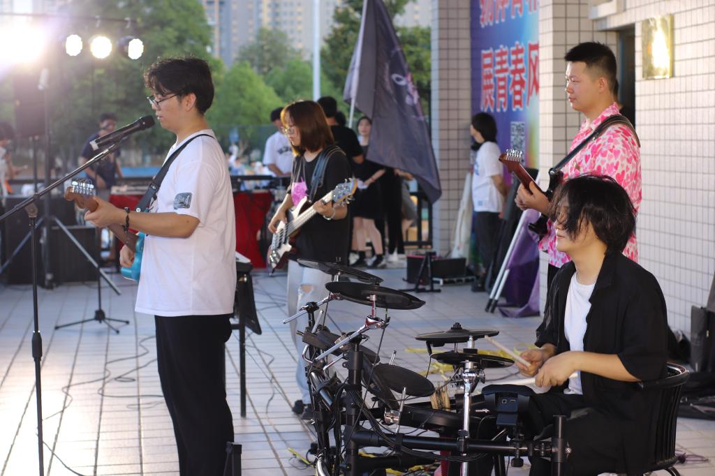 在近四个小时的时间里,无论是乐手还是观众,激情和热情一浪高过一浪,点燃了全场气氛。来自我校的天一乐团“冰点乐队(icepoint)”一上场,尖叫声、呐喊声此起彼伏,一曲《极乐都市》、《奇迹再现》更是引得全场掌声雷动。来自汉江师范学院贰天乐队的安琦带着《想去海边吗》、《爱人错过》等金曲,轮番上台、激情演奏,感染了在场所有观众。
