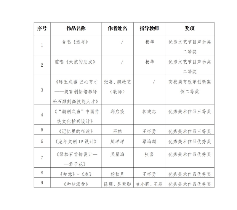 新闻网讯(通讯员 高静)近日,湖北省第八届大学生艺术节系列活动评选结果公布,我校师生在优秀文艺节目、优秀美术作品、优秀艺术实践工作坊、高校美育改革创新案例(“三优一案例”)评选中获奖9项,其中二等奖3项、三等奖2项、优秀奖4项。