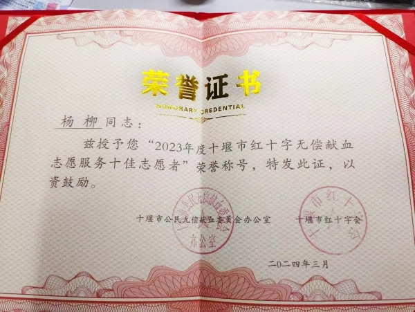 其中,我校杨柳、杨周2名同学荣获“2023年度十堰市优秀红十字志愿者”称号;周郝圣灵、朱凡、代礼意、杨周4名同学被评为“2023年度十堰市红十字无偿献血志愿服务优秀志愿者”;杨柳同学被评为“2023年度十堰市红十字无偿献血志愿服务十佳志愿者”。
